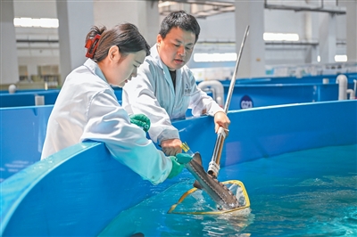 湖北宜昌,三峡大坝一侧,占地5万多平方米的长江珍稀鱼类保育中心内,一条条长约20厘米的黑色鱼苗在养殖池内欢快地摆动尾巴。科研人员仔细检查智能温控系统运行状态,逐池监测记录各项水质指标。